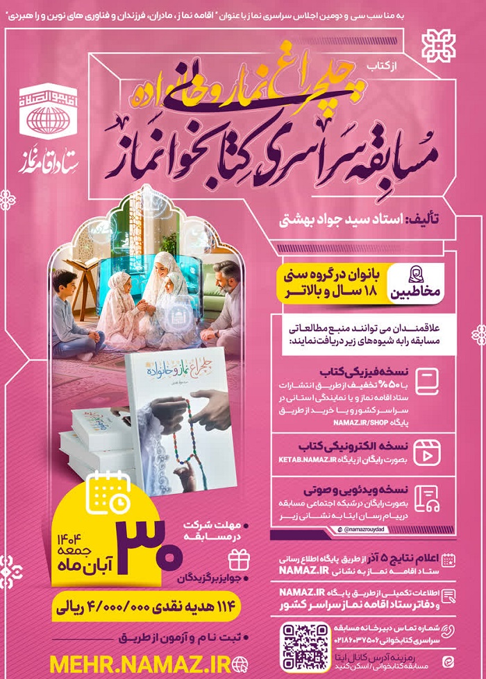 با توجه به برگزاری سی و دومین اجلاس سراسری نماز با موضوع " اقامه نماز ، مادران و فرزندان و فناوری های  نوین و راهبردی "  مسابقه  سراسری کتابخوانی نماز از کتاب " چلچراغ نماز و خانواده " با ملاحظات ذیل برگزار خواهد شد.