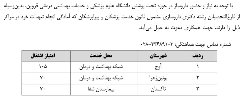 جذب نیروی داروساز مشمول قانون خدمت ۲۵ آذر ۱۴۰۴ | ۰۹:۰۰ کد : ۵۷۰۵۷ اطلاعیه ارسال به دیگران نام شما ایمیل شما ایمیل دریافتکننده ارسال انصراف تعداد بازدید:۵۶۹ جذب نیروی داروساز مشمول قانون خدمت در دانشگاه علوم پزشکی قزوین